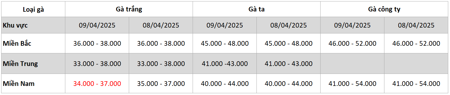 2. Bảng giá gà ngày 09/04/2025: