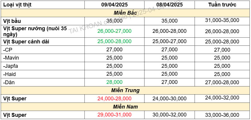 3. Bảng giá vịt ngày 09/04/2025: