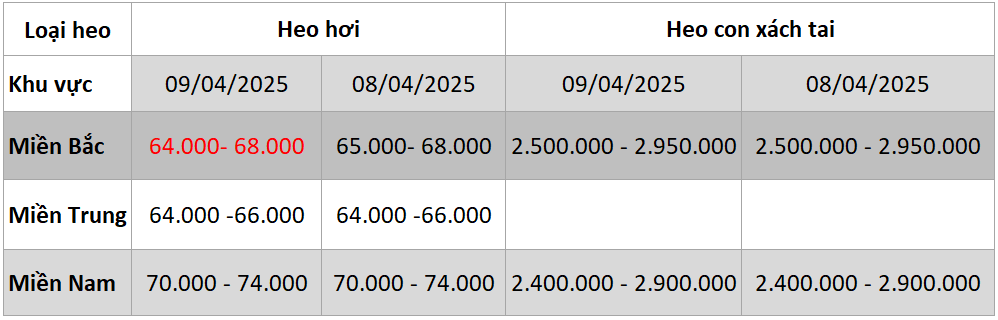- Bảng giá heo ngày 09/04/2025: