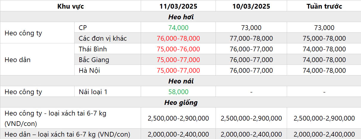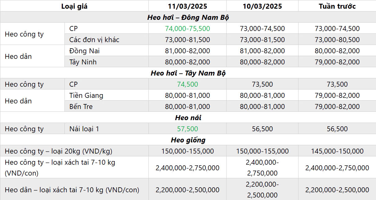 A. BẢNG GIÁ HEO HƠI HÔM NAY NGÀY 11/03/2025