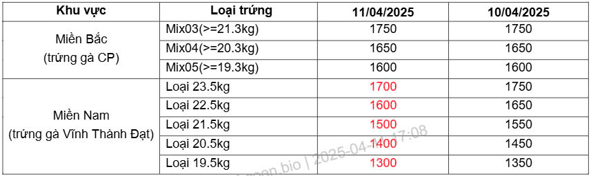 4. Bảng giá trứng ngày 11/04/2025: