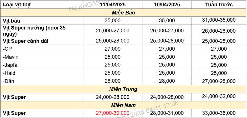 3. Bảng giá vịt ngày 11/04/2025: