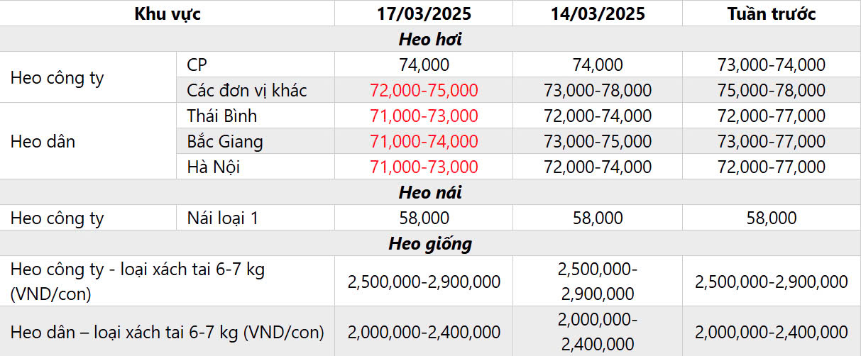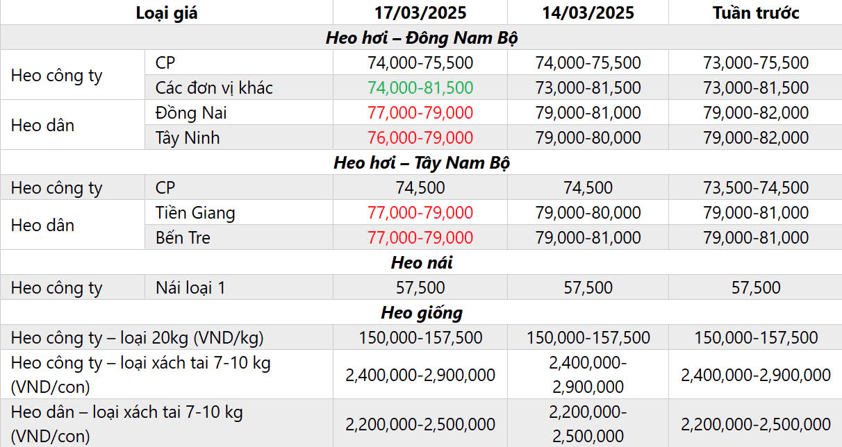 A. BẢNG GIÁ HEO HƠI HÔM NAY NGÀY 17/03/2025