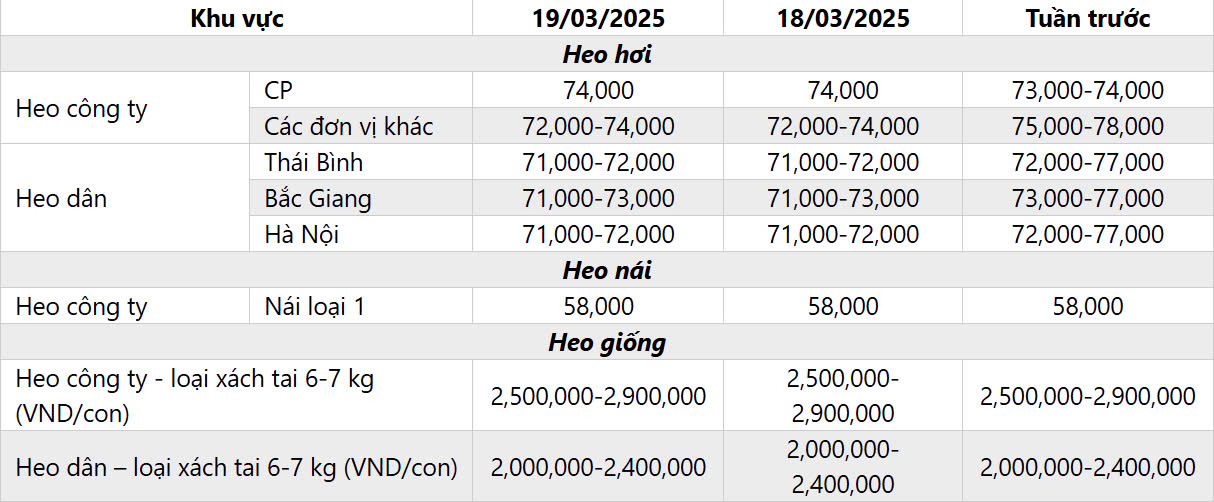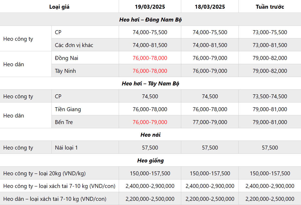 A. BẢNG GIÁ HEO HƠI HÔM NAY NGÀY 19/03/2025